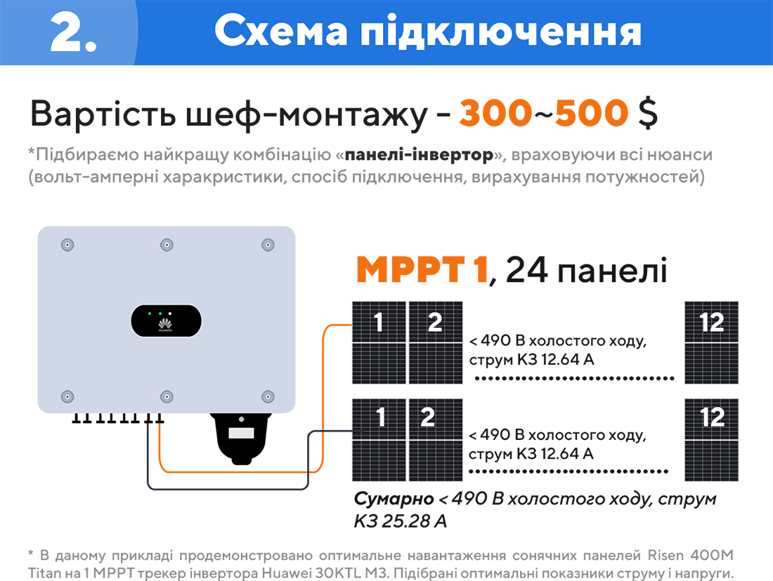 • На четвертому кроці ми підключаємо сонячні панелі до інвертора та налаштовуємо систему захисту по лінії постійного струму. Панелі необхідно правильно скомутувати, щоб не вийти за номінальні робочі діапазони інвертора. Радимо скористатися послугою шеф-монтажу, так ви матимете 100% успішного підключення і налаштування всієї системи.